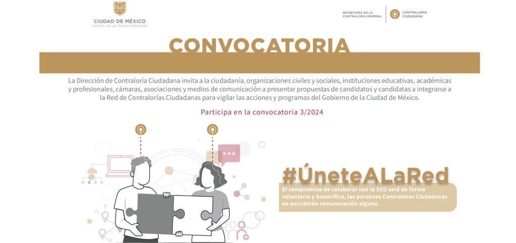La Secretaría de la Contraloría General de la Ciudad de México publica la información oficial de la Red de Contralorías Ciudadanas, un programa que promueve la participación social en la supervisión y evaluación de acciones gubernamentales. En esta página se encuentran los resultados de la Convocatoria 1/2025, así como los documentos necesarios para participar: solicitud de inscripción, carta compromiso, consentimiento de publicación y carta manifestación.